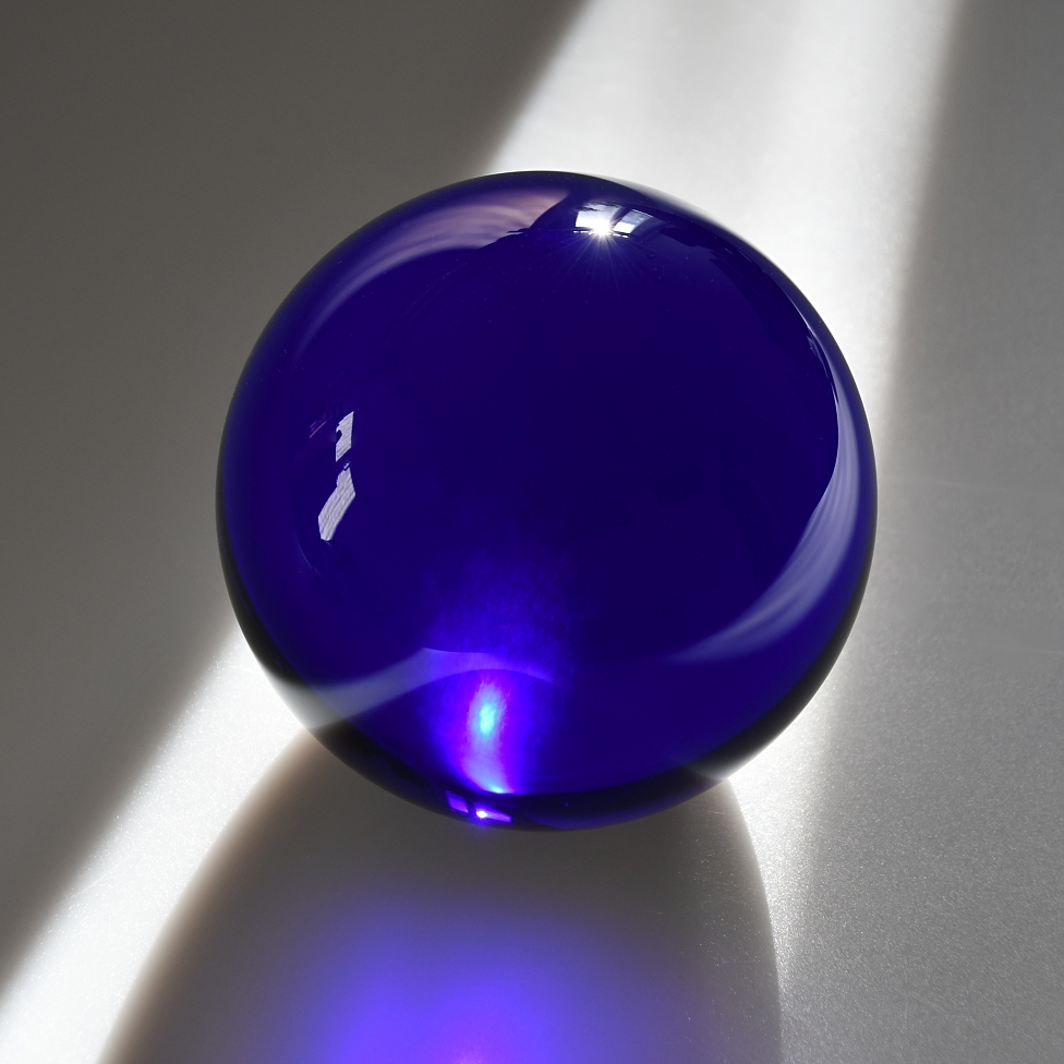 Skleněná modrá koule o průměru 120 mm s ploškou na stání. Kvalitní sklo mechanicky broušené a leštěné.
