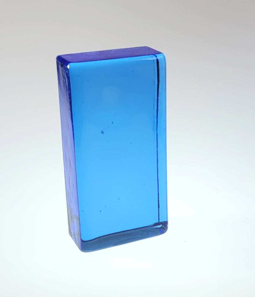 Vylisovaný skleněný kvádr, vyrobený z barevné skloviny.